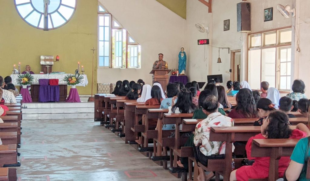 Mempawah, Polda Kalbar – Kapolsek Sungai Pinyuh Polres Mempawah AKP Rismanto Ginting melaksanakan Safari Minggu Kasih di Gereja St. Christophorus Sungai Pinyuh, Minggu (18/2/2024) pagi.