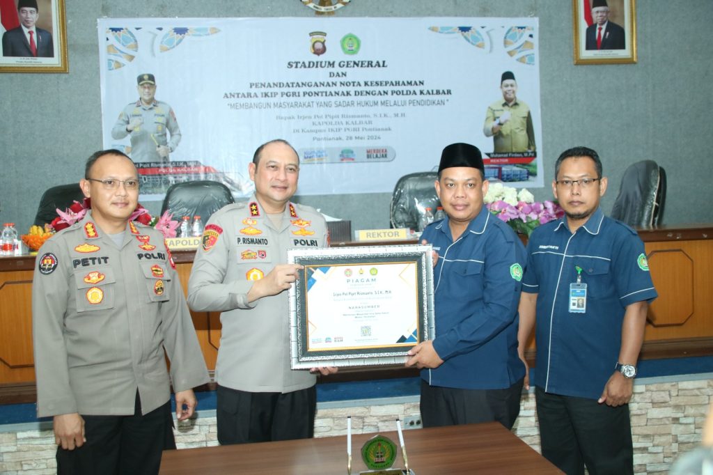 Pontianak, Polda Kalbar – Kapolda Kalbar Irjen Pol Pipit Rismanto, S.IK., M.H., melaksanakan penandatanganan MOU sekaligus memberikan Kuliah Umum di IKIP PGRI Pontianak pada hari Selasa (28/5).