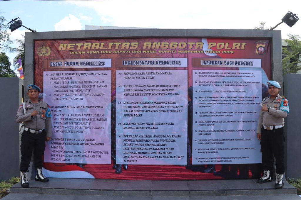 Mempawah (Suara Kalbar) – Polres Mempawah Polda Kalbar menjamin akan selalu bersikap netral dan tidak akan melakukan politik praktis dalam Pemilihan Kepala Daerah (Pilkada) Serentak 2024.
