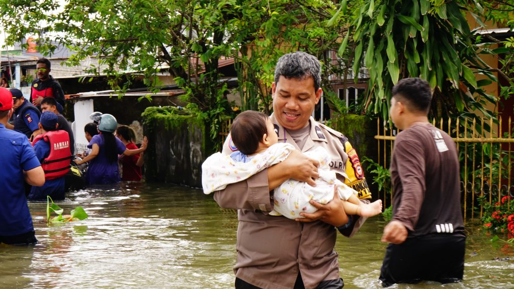 Makassar – Polri bergerak cepat melakukan evakuasi korban banjir di Kota Makassar, Sulawesi Selatan, Rabu (12/2/2025). Curah hujan yang tinggi mengakibatkan empat kelurahan di Kecamatan Manggala terendam air setinggi dada orang dewasa.