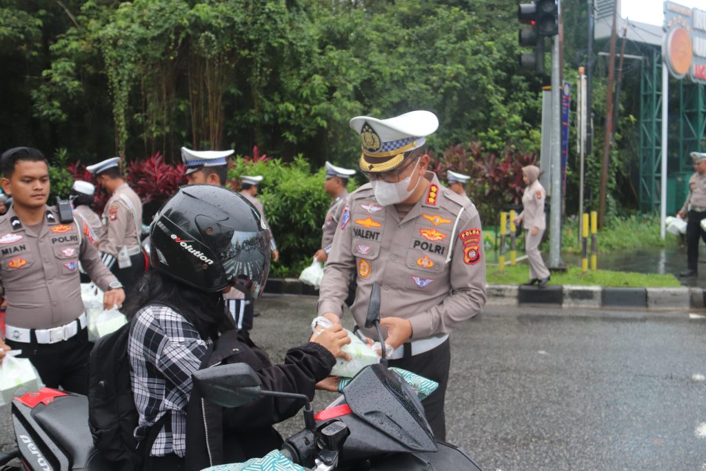PONTIANAK, Polda Kalbar – Direktur Lalu Lintas Polda Kalbar, Kombes Pol. Valentinus Asmoro bersama anggota Ditlantas dan Ditsamapta Polda Kalbar melaksanakan kegiatan bakti sosial dengan membagikan takjil gratis kepada pengguna kendaraan di sekitar Traffic Light Bundaran Tugu Digulis Universitas Tanjungpura Pontianak, pada Jumat (7/3).