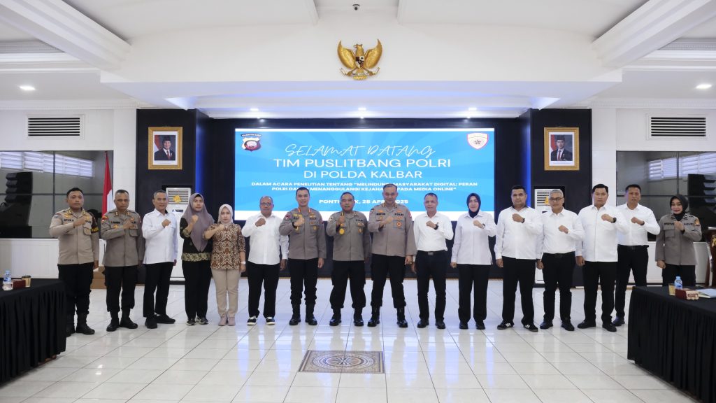 PONTIANAK, Bertempat di Ruang Graha Khatulistiwa Polda Kalbar, Puslitbang Polri laksanakan kunjungan ke Polda Kalbar dalam rangka penelitian terkait kejahatan pada Media Online dengan tema “Melindungi Masyarakat Digital : Peran Polri Dalam Menanggulangi Kejahatan Pada Media Online”. (Senin, 28/4/2025)