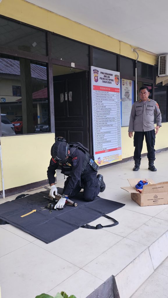 Ketapang – Polda Kalbar, Kepolisian Resor (Polres) Ketapang bersama Satuan Brimob Polda Kalimantan Barat memusnahkan sejumlah bahan peledak aktif berupa sebuah mortir dan sebuah granat yang ditemukan warga di wilayah Kecamatan Muara Pawan Kabupaten Ketapang beberapa waktu lalu. Proses pemusnahan dilakukan dengan prosedur keamanan tinggi oleh Tim Penjinak Bom (Jibom) Brimob Polda Kalbar untuk memastikan tidak ada ancaman bahaya bagi warga masyarakat.
