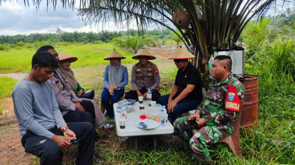 Sebelum proses penanaman dimulai, sejumlah unsur yang terlibat tampak duduk bersama di lokasi lahan perkebunan, berdiskusi santai di bawah rindangnya pohon kelapa sawit.